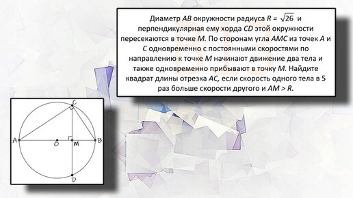 Как решить? Диаметр АВ окружности радиуса R = √26 и перпендикулярная ему хорда CD этой окружности пересекаются в точке М...