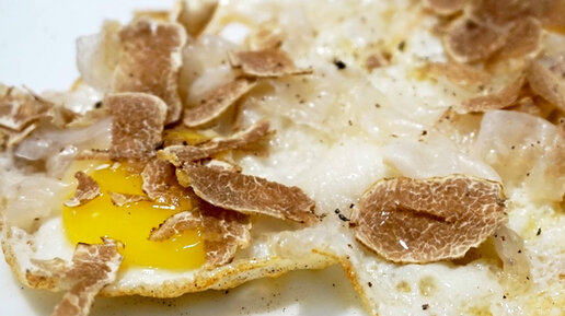 Готовим деликатесную яичницу с перепелиными яйцами, тонкими ломтиками сала и натираем трюфель