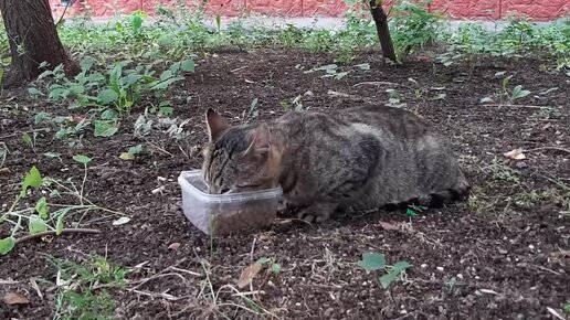 Кормим бездомного кота в нашем дворе