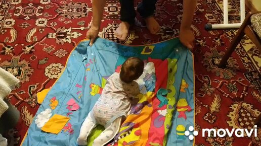 Катаем двухмесячного малыша на коврике, тренировка переворотов на спину
