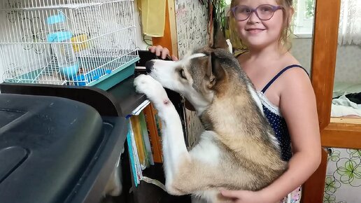 Крыска Ириска в клетке весело играет, а Алиска забавно наблюдает за ней