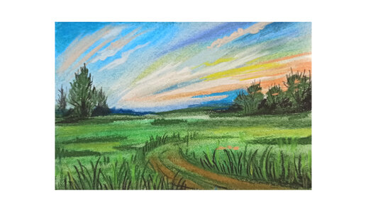 Дорога через луг. Пейзаж нарисованный сухой пастелью