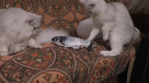 Кот хватает рыбу и бежит с ней.