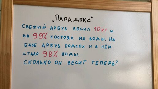 Попробуйте решить: Сколько станет весить 10-кг арбуз, если воды в нём станет 98% вместо 99%?