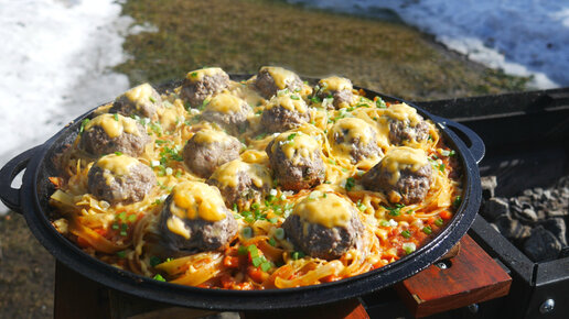 ГНЕЗДА ИЗ МАКАРОН С ФАРШЕМ В СКОВОРОДЕ НА ОГНЕ