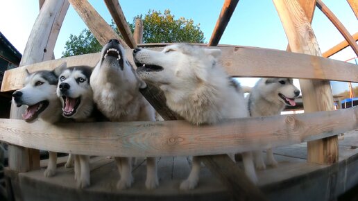Раз, два, три! Стая, хаски вышла на утреннюю раздачу леща.