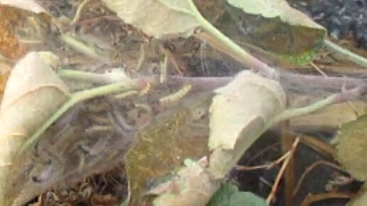 Обнаружил нового вредителя на яблоне. Гусеницы в паутине.