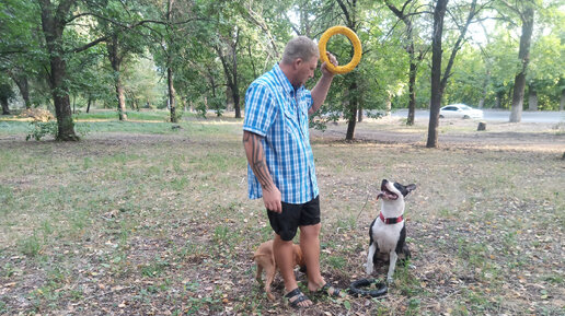 Питбулька из Белоруссии осваивает команду "ко мне", получился почти видеоурок.