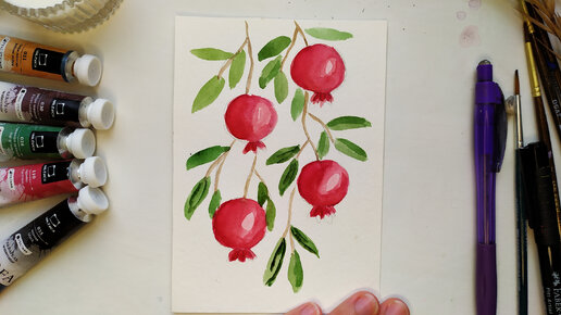 Рисуем ветки с гранатом акварелью просто