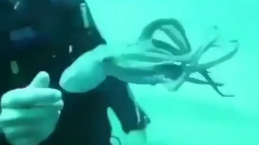 Малыш осминога играет с дайвером