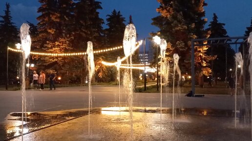 Фонтаны украсили сквер около Южно-Уральского университета. Вечер августа в Челябинске.