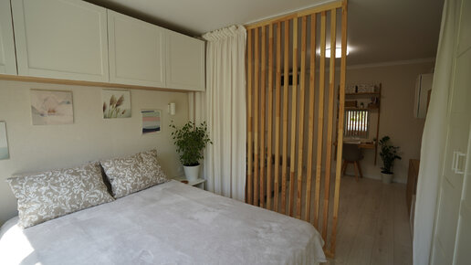 Спальня с большой кроватью, гардеробом и все это в крохотной однушке. Как?