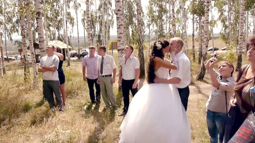 Молодожёны в лесу, свидетель прикрепляет бутылку на дерево