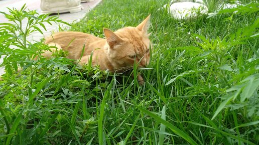 Рыжик у Магнита любит полежать в зелёной травке