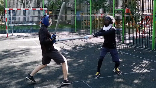 Урок фехтования катаной. Кендзюцу. Учебный спарринг на длинных мечах с учеником летом