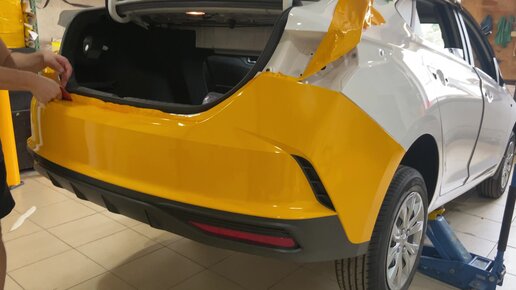 Мастера показывают секреты по оклейке заднего бампера на Hyundai Solaris под такси