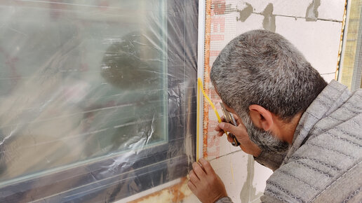 Элемент примыкания режем болгаркой, приклеиваем на оконную раму, приклеиваем полиэтиленовую плёнку для защиты окон от грунтовки