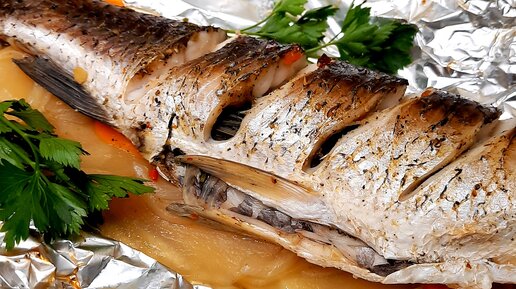 Белый амур на овощной подложке, запечённый в духовке