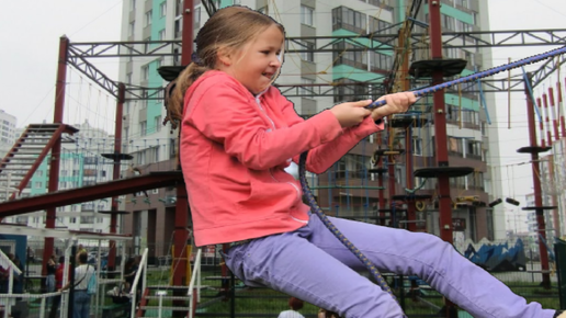Парк из верёвок и канатов рядом с домом. Подростки стоят в очередь