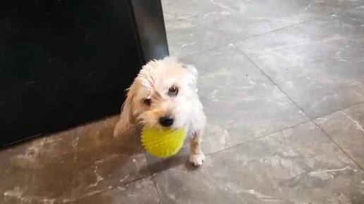 Собака- спинальник приносит мячик