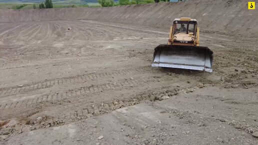 Строительство пруда в с. Лечебное Белогорского района. Планировка откосов бульдозером.