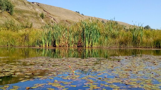 Крупняк в траве тащит поплавок . Крупный карась ,линь . Рыбалка на поплавок