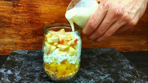 Просто кладу в банку творог, фрукты, овсянку: заливаю всё кефиром и забываю на ночь в холодильнике (ну очень вкусно на завтрак)