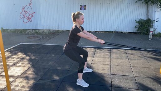 Тренировка ягодичных мышц с длинными резинками на спортивной площадке