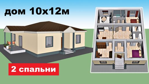 Проект одноэтажного дома 10х12м. 2 спальни, терраса. План дома, дизайн. Проекты домов, обзор дома.