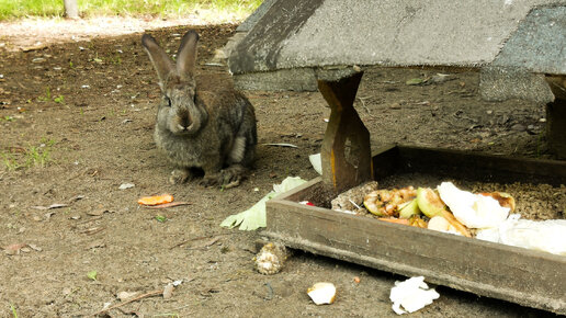 Взрослый кролик отогнал малыша от кормушки с едой в лесу.