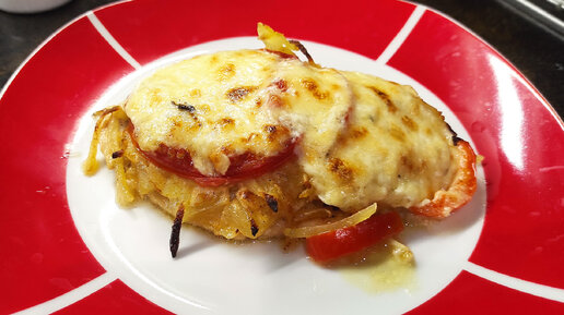 Мясо по-французски с картофелем, помидорами и сыром