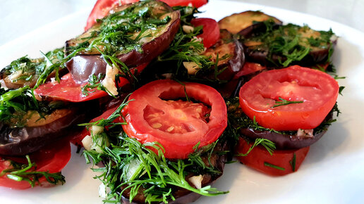 Простой рецепт вкусной закуски: солю свежие помидоры и укладываю слоями с жареными баклажанами, чесноком и зеленью