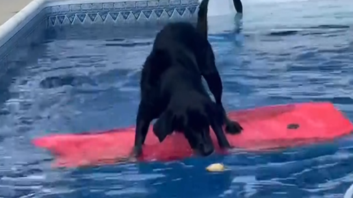 Собака научилась сёрфить, чтобы доставать из бассейна мяч и не мокнуть