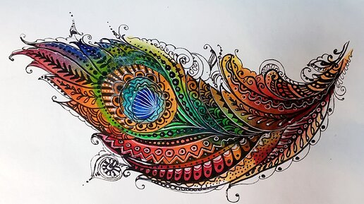 Акварель, маркер — перо Жар-птицы в стиле дудлинг