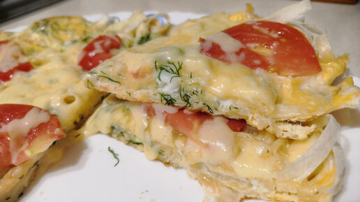 Тонко нарезаю лаваш и готовлю простой завтрак на сковороде с яйцами, сыром и помидором