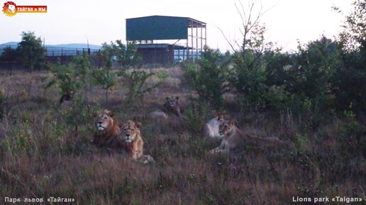 Вечерняя жизнь молодых львов. Съемка дроном после заката.