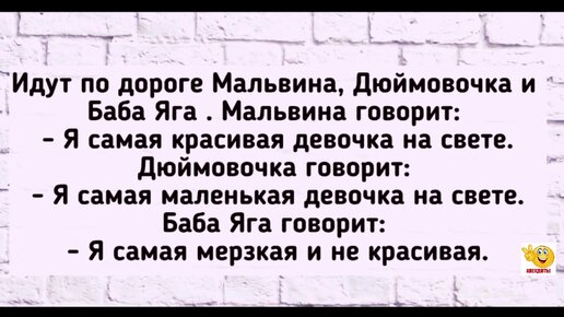 Идут по дороге Мальвина, Дюймовочка и Баба Яга. Мальвина говорит: - Я самая красивая девочка на свете