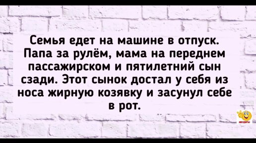 Семья едет на машине в отпуск. Папа за рулем, мама на пассажирском, пятилетний сын сзади. Этот сынок достал у себя из носа