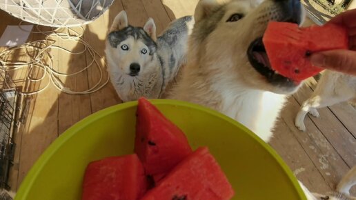 Стая хаски обожает арбуз, они наверное думают это мяср, просто сладкое)