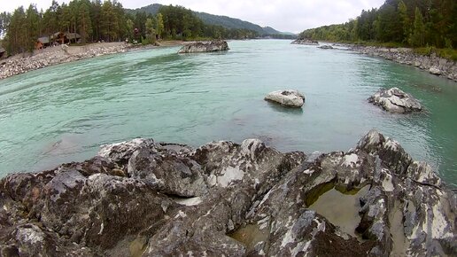 Красивая осень на скалах в русле реки. Вода бирюзового цвета