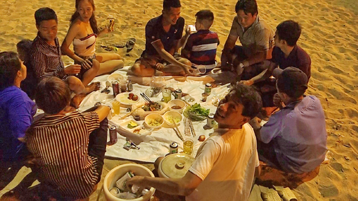 Теплым вечером на городском пляже Нячанга. Пляжный пикник Вьетнамцев. Стал свидетелем небольшого ДТП на дороге