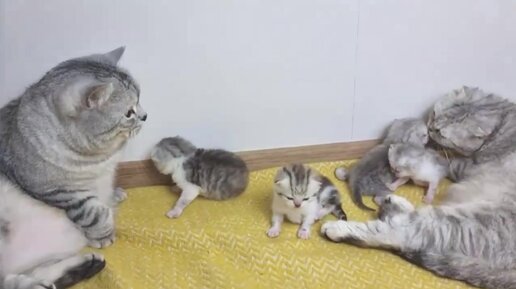 Супер заботливый папа кот целует маму кошку и своих мяукающих котят