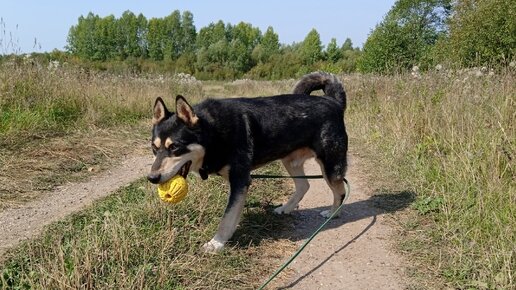 Пес Амур хранит свой мячик, как зеницу ока, и даже на прогулку берет его с собой