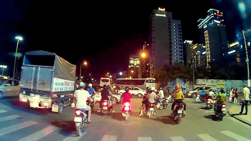 Вечерняя поездка на мотоцикле по Нячангу. Еду на ужин в популярный ресторан "Москва". Город полон огней и гуляющих людей