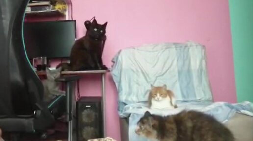 Коты изучают котенка Кирюшу.