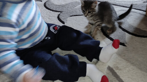 Малыш и котик. Забавные и игривые. Впервые в нашей квартире котик карапуз очень рад.