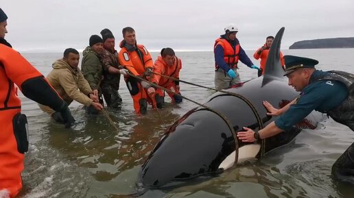 МЧС и волонтеры спасли детеныша косатки, выброшенного на отмель в бухте Нагаева в Магадане.