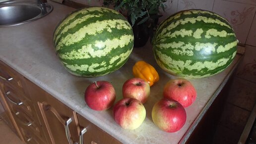 На кухне стол, а на столе арбузы и яблоки и цветы. Видео про два арбуза