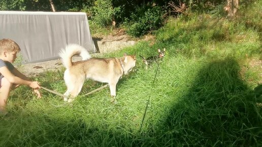 Алиса настойчиво пристает к Розочке, запутывает поводок и пытается поиграть с ней