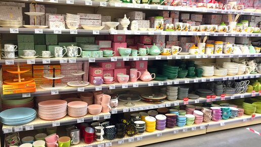 Красивая посуда и товары для кухни на полочках магазина. Обзор ассортимента посуды.